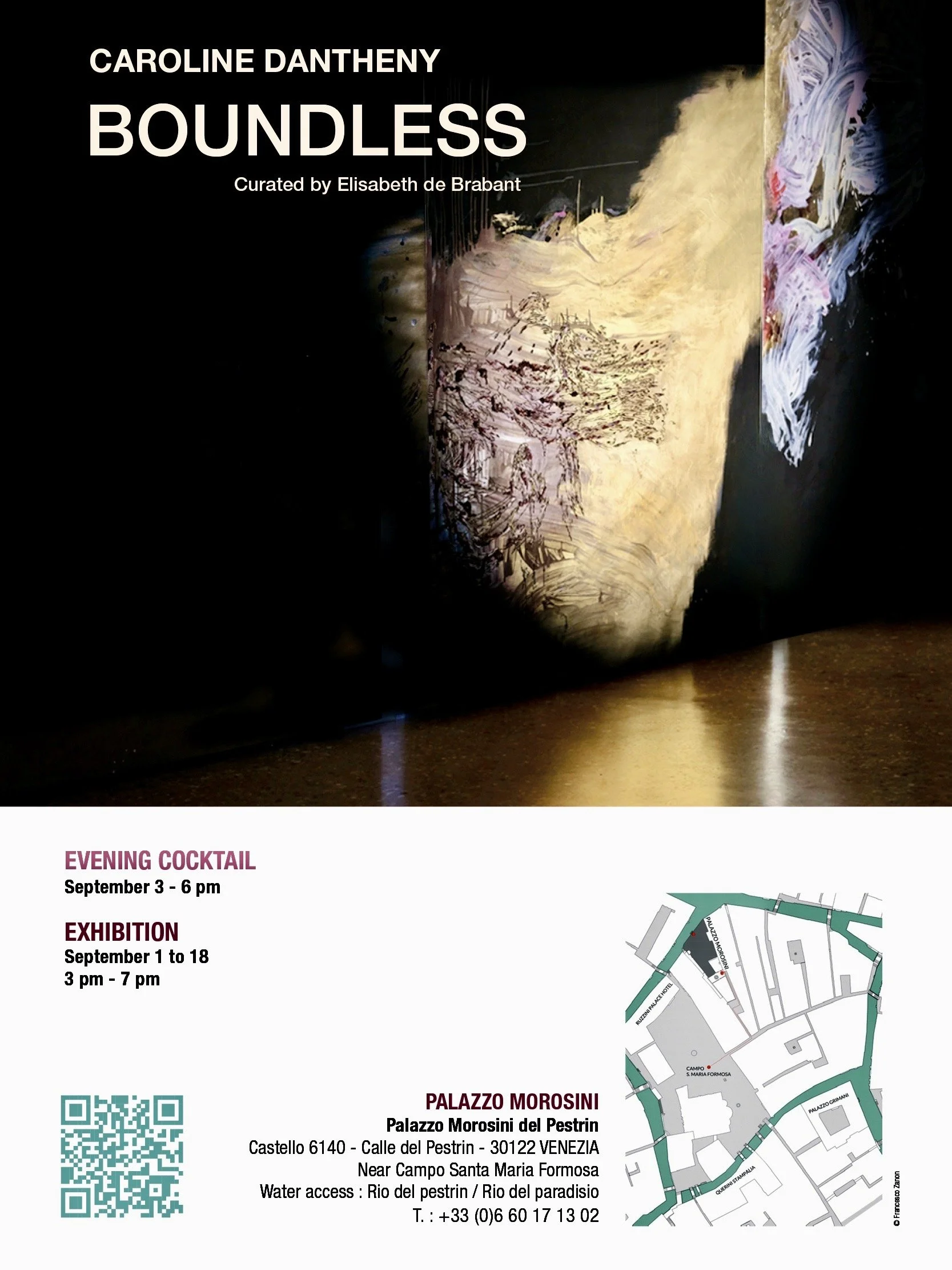 À l'occasion du 79e Festival du film de Venise, nous vous invitons à un cocktail le 3 septembre à partir de 18 h au Palazzo Morosini del Pestrin pour l'exposition Boundless, œuvres de Caroline Dantheny, curation Elisabeth de Brabant.